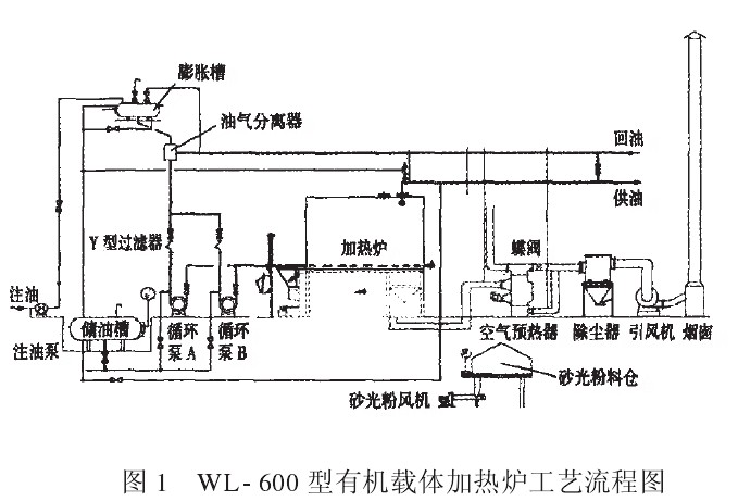 人造板企業(yè)傳統(tǒng)導熱油供熱系統(tǒng):電加熱導熱油爐系統(tǒng)采用WL-600型有機載體加熱爐,該加熱油爐以木材廢料、廢板、鋸屑、砂光粉、煤及可燃垃圾中的一種或幾種為混合燃料,經燃燒室燃燒產生熱能將有機熱載體(導熱油)加熱,再經過循環(huán)泵的強制循環(huán)將高溫有機熱載體送給用熱設備并返回后對其重新加熱。該系統(tǒng)由燃燒室、熱油循環(huán)系統(tǒng)、煙氣排放系統(tǒng)等幾部分組成,其中熱油循環(huán)系統(tǒng)是將導熱油加熱后提供給干燥機散熱器、熱壓機、調供膠系統(tǒng)、制膠車間等用熱點,煙氣排放系統(tǒng)是將燃燒室燃料燃燒產生的煙氣經凈化后排放到大氣中,其工藝流程如圖1所示。加熱爐燃料需求量計算WL-600型有機載體加熱爐額定發(fā)熱量為600×104kcal/h、熱效率為70%,管道平均熱損失系數為1.07,其燃料熱量需求量為:Q0=600×104×1.07/0.7=917×104kcal/h該電加熱導熱油爐主要原料為廢木材,每公斤絕干廢木材發(fā)熱量約為4000 kcal,當該導熱油爐全負荷工作時每小時絕干廢木材需求量約為2290kg,則每年絕干廢木材需求量約為16488t。