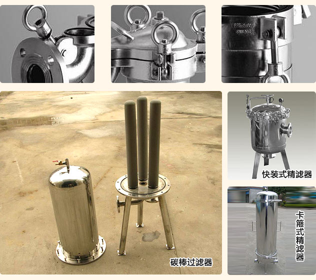 精密過濾器(又稱作保安過濾器),筒體外殼一般采用不銹鋼材質(zhì),內(nèi)部采用PP熔噴、線燒、折疊、鈦濾芯、活性炭濾芯等管狀濾芯作為過濾元件,根據(jù)不同的過濾介質(zhì)及設(shè)計工藝選擇不同的過濾元件,以達到出水水質(zhì)的要求。機體也可選用快裝式,以方便快捷的更換濾芯及清洗。該設(shè)備廣泛應(yīng)用于制藥、化工、食品、飲料、水處理、釀造、石油、印染、環(huán)保等行業(yè),是各類液體過濾、澄清、提純處理的理想設(shè)備。